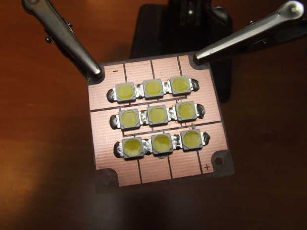 Después de todo los LEDs fueron soldados en el tablero, un control de encendido rápido (algunos segundos) probó la matriz estaba funcionando correctamente y la salida de luz era enorme. Si usted comete el error de mirar hacia los LEDs (como hice yo) te garantizo que verás nueve puntos de luz durante mucho tiempo. Que voy a hacer buen uso de esta luz muy uniforme.