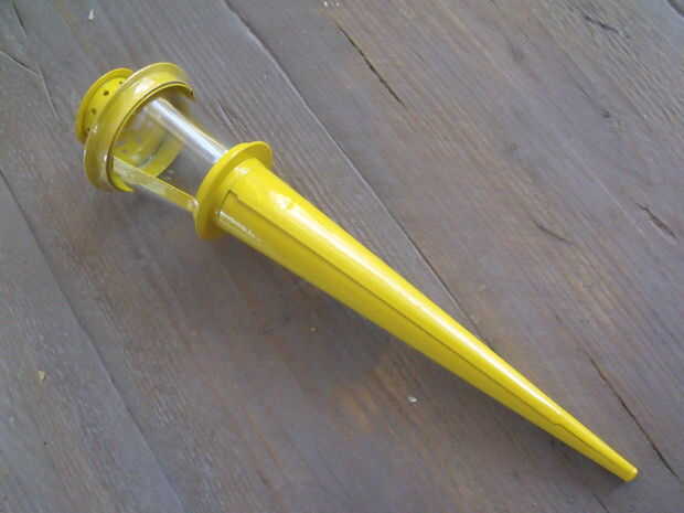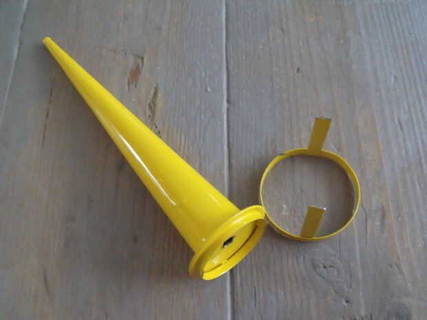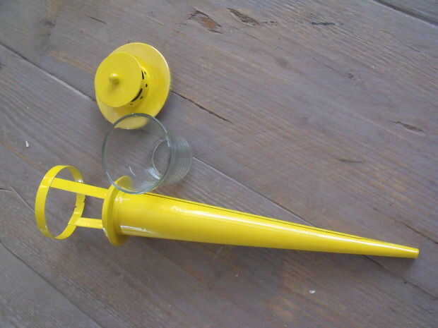 El agujero pequeño en el extremo del cono me llamó la atención porque era del tamaño adecuado para un cable eléctrico. Al principio sólo quería usar el cono. Con una sierra pequeña quité el cual parte tiene el vidrio. Descubrí que la tapa podría montarse en el cono cuando se coloca boca abajo. Parecía una característica agradable por lo que quité la perilla redonda de la tapa, perforar un agujero a través de y había colocado en el cono. (ver página de intro y página 4)