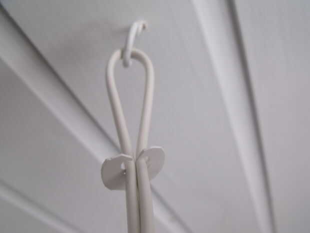 Como en mi caso que la lámpara no es justo bajo el punto de anclaje de techo, he atornillado en un gancho y coloca el cable en un bucle.