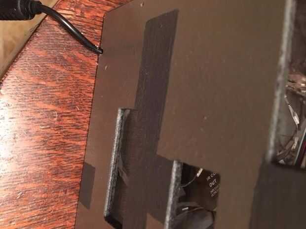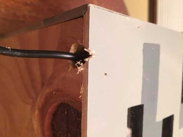 El último paso para completar el cuadro estaba haciendo un agujero para los cables de LED escapar desde el interior de la caja. Para este paso, sólo taladré un agujero en la parte inferior que permite el cable escapar y cortar una pequeña muesca para permitir que los cables se sientan libremente sin estar bajo el peso de la caja.