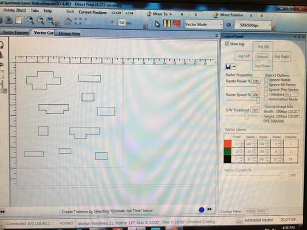 Primero diseño la plantilla para los cortes en Inkscape (un programa de diseño gratis) y luego simplemente carga el archivo a ser impreso en el programa de la cortadora láser.