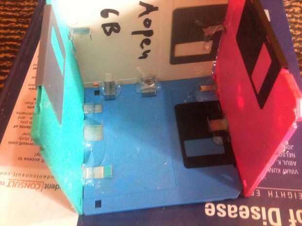 4. Mover sistemáticamente y agregar disquetes hasta que consigas 3 paredes y un piso como en la última foto. Al llegar a esta etapa, no añada ninguna más disquetes hasta el siguiente paso.
