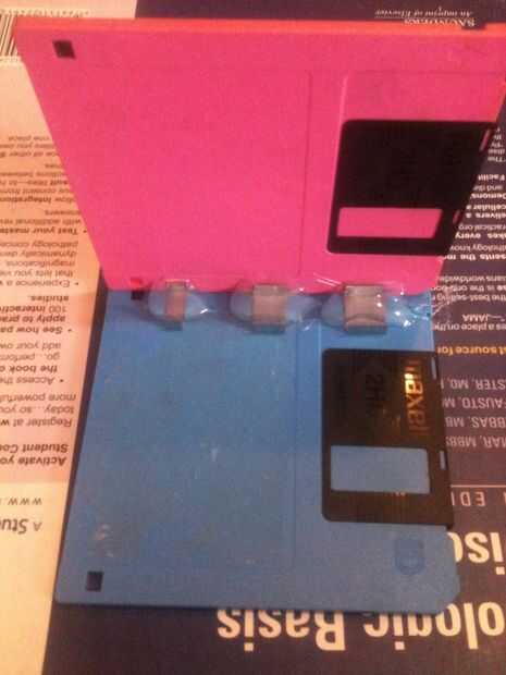 2. Cómo me acerqué que junté dos disquetes, luego añadió una pequeña cantidad de pegamento a los lados de la reunión. Pongo algunas grapas en allí para la fuerza agregada. Luego deje que se congele, luego agregar otro pedazo de grapas para el refuerzo. He intentado esto por capricho y demostró para ser muy fuerte. He intentado tirar aparte una vez y la cubierta del disquete entero vino aparte.