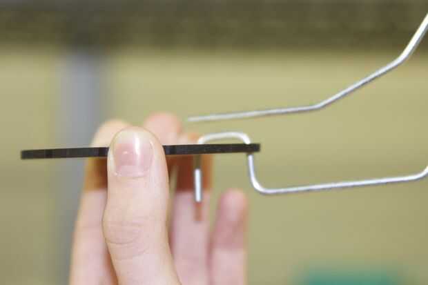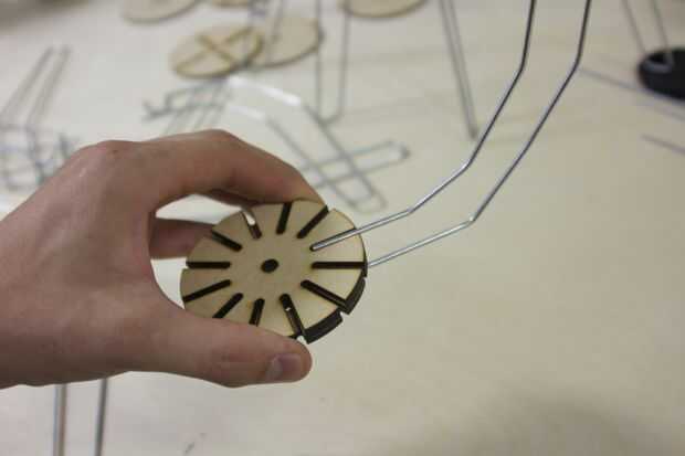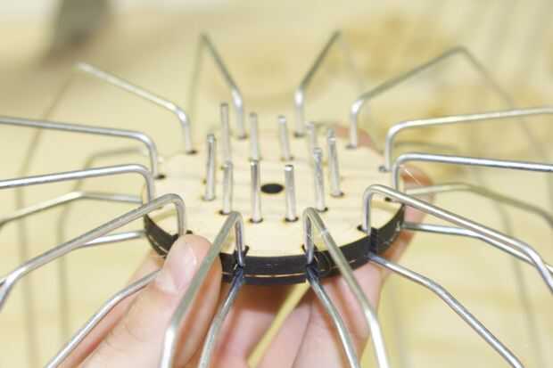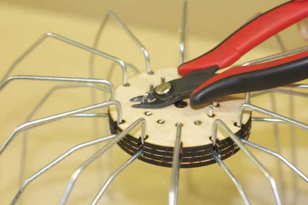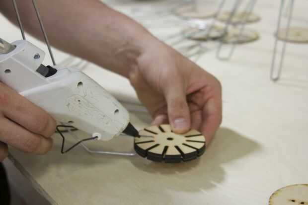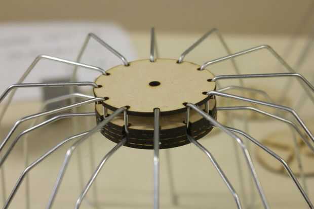 B. estos tres son lo que los "rayos de la pantalla de" entrar. Voltear las piezas de madera boca abajo y coloque el lado cuadrado de la "pantalla de radio" en el canal y de los orificios inferiores de las piezas de madera. Caliente pegar cada pieza en y asegúrese de que el cable quede alineada con la parte superior.