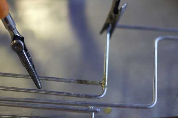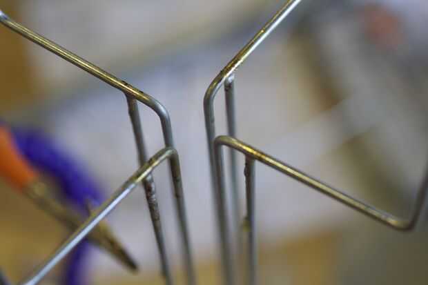 C. ahora puede empezar a soldarlos juntos. Hay 4 articulaciones que necesitan conseguir soldados en total. Esto es donde la parte superior de los "postes de luz exterior" las partes horizontales de la parte inferior de los "postes de la lámpara interior." Al soldar, asegúrese de que la distancia entre los cables del poste de 2 lámpara son la misma distancia que la longitud entre los agujeros en las piezas de madera que van a través.