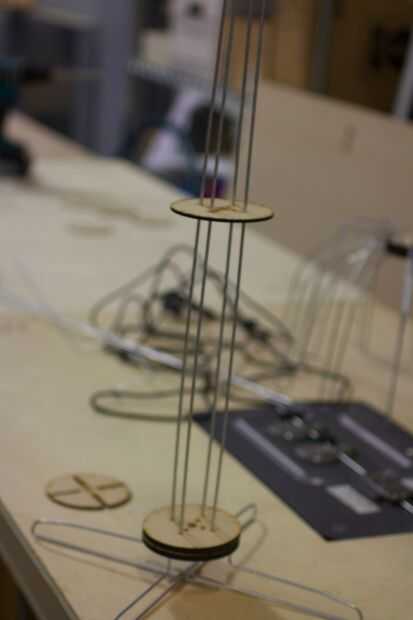 B. ahora están listas para ir las 4 piezas "Poste de la luz interior" de alambre. Deslice las piezas (lado recto primera) en los 4 orificios internos de todas las piezas de madera. Estas piezas de alambre deben ser capaces de deslizar toda la manera a través de las piezas de madera a la parte inferior.