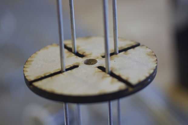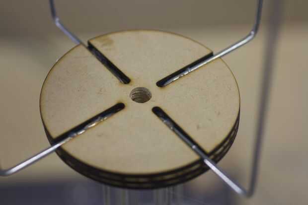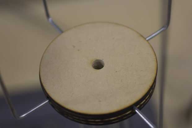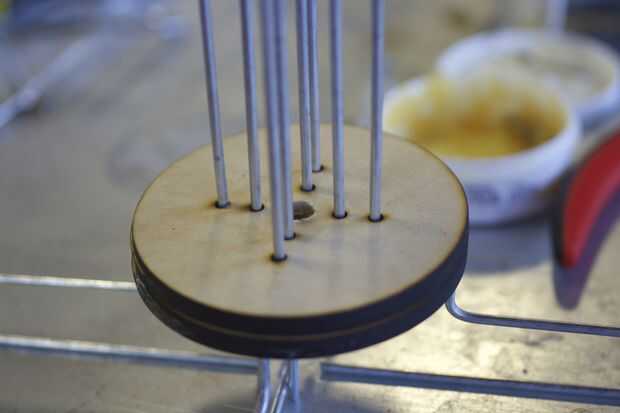 A. para comenzar esta fase tomar "Capa 1" de la Asamblea media y deslice sobre los 4 cables de "Farola exterior". Asegúrese de que están los 4 cables en los agujeros más lejanos al borde de la pieza de madera. Deslice esta pieza a la mitad. Esta pieza es sobre ahora todo juntos mientras que siendo soldado.