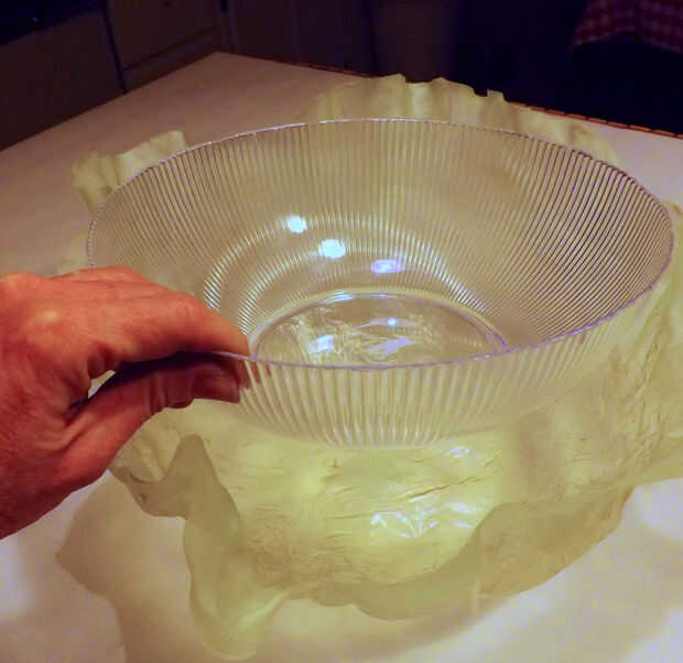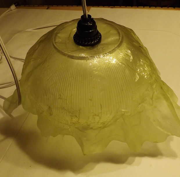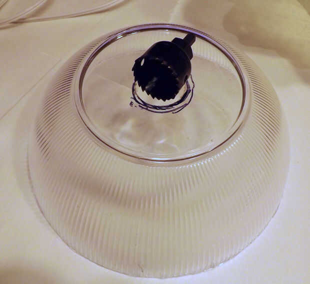 Recuperar la ensaladera plástico de tienda de dólar para el uso en el candelabro DIY. Este será el esqueleto de las medusas y resistirá la pantalla de seda. Marque donde hacer un agujero en el recipiente de plástico donde se ajuste la lámpara. Taladro (utilicé una broca agujero de 1"). Coloque el recipiente de plástico dentro de la pantalla de seda y marca donde el agujero luego se, corta un círculo en la seda de la lámpara a través del hilo de rosca.
