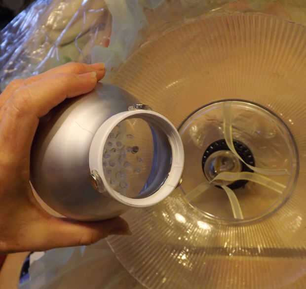 Para sujetar el aerosol de la fibra óptica a la sombra de la araña, todo lo que tienes que hacer es mantenerlo cerca de la bombilla y los imanes de la cinta saltan en su lugar alrededor de la caja de luz de inundación. Repetí eso varias veces por el gusto de hacerlo.