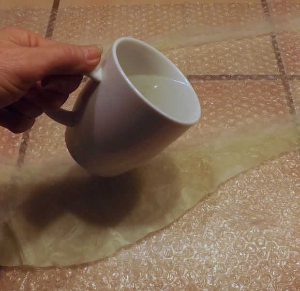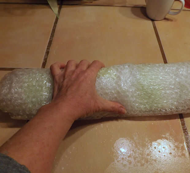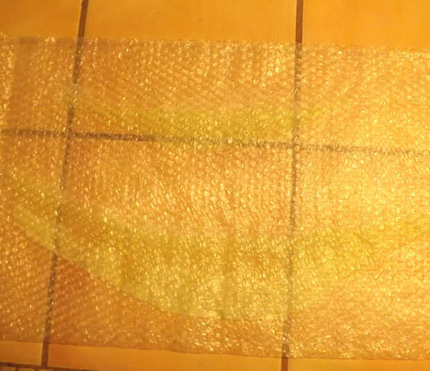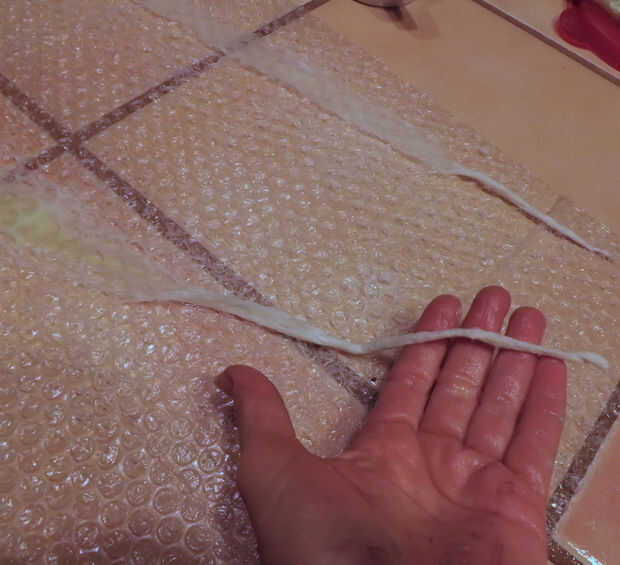Utilizando la misma húmeda método utilizado en mi cuello fusionado fibra de cepillo para Afieltrar, ponen las piezas de seda sobre un trozo de plástico de burbuja, extensión tenues trozos de lana de merino a lo largo de la cara interna de la media luna y más lana por un extremo de la media luna. Esto fue volteado y lana un poco más añadido al otro lado para que las fibras fusible a través de la seda y en uno al otro. La fusión pasa al mojar la lana con agua jabonosa caliente, cubrir con otra capa de abrigo de burbuja y agitar. Una vez usé un búfer de coche para agitar las fibras de lana, pero quería más control sobre mi proyecto esta vez, usé el método de balanceo en la foto.