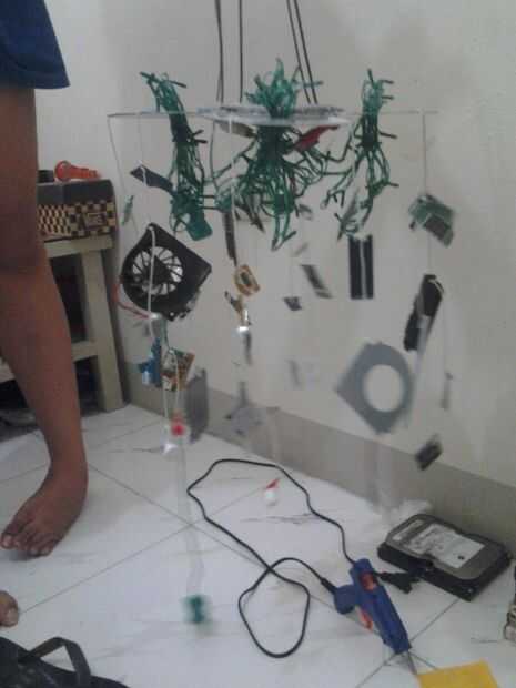 Poner las luces de Navidad a los agujeros de los CDs. Dividir correctamente. Atar las luces de Navidad con cualquier yarda del lado donde el conector Jack es para que no caiga.