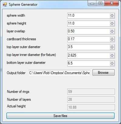2. dirígete a http://www.thingiverse.com/thing:14272 para descargar los archivos de plantilla de laser o SphereGen.exe que se generan las plantillas para usted. SphereGen permite especificar el grosor de su cartón, el ancho deseado, la altura, y cuánto cada uno capa deben superponerse capas adyacentes. Si usted va a utilizar el Ikea "Hemma" cable de alimentación como lámpara, el diámetro interior debe ser de 1,575 pulgadas.