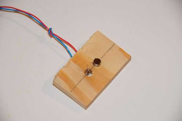 Tome un pedazo pequeño de madera y taladre dos orificios a la misma distancia entre ellos como los tornillos, que pones en el conector de alimentación de la bombilla. Los orificios deben estar del mismo tamaño que sus imanes puede exprimir el imán junto con un una poser llevar en el agujero.
