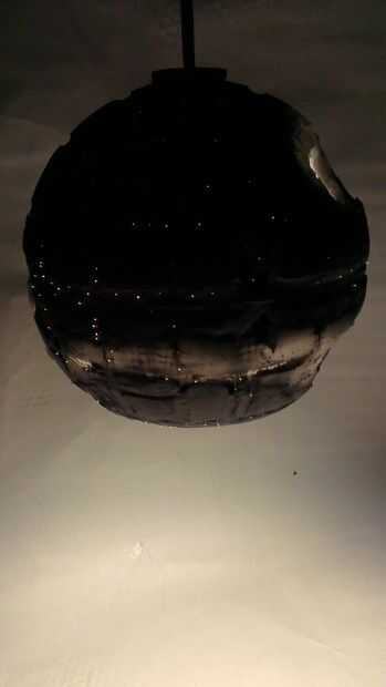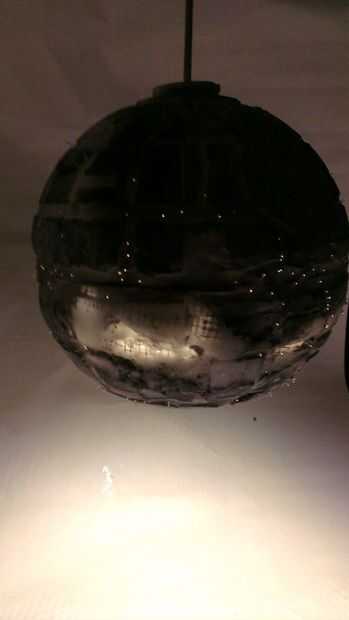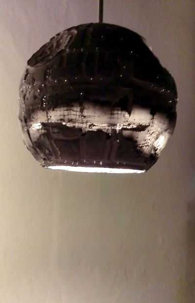 Como una prueba rápida, perforó un agujero de 32mm en la parte superior y me aseguró una luz de SES de una lámpara rota. Porque la pantalla es más bien pequeña, usé una bombilla LED detener sobrecalentamiento. La lámpara no es muy pesada pero te tengo una mejor manera de solucionar este problema antes de que se dejo colgar en cualquier lugar... aunque no puedo imaginar qué habitación le cuelgo esto...