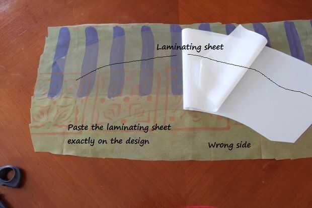 Mi tela tenía muchas impresiones sobre él, guardé el corte pieza laminada de diferentes maneras y finalmente decidió que las líneas en el marco. Usé a tela transparente, la pieza sobrante de mis cortinas. En el lado equivocado de la tela pegar el laminado corte colocación exactamente cómo desea que el diseño en el marco de la pieza. Si es un material liso no hay necesidad de preocuparse por ello.