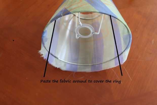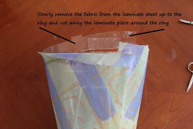 El siguiente paso es realmente lento. Lentamente retire a la tela de la hoja de laminado hasta el anillo y a cortar el laminado alrededor del anillo. Ver que el anillo no se mueve, si luego se pegue un cellotape. Una vez cortado el laminado parte derecha ronda el uso la pistola de pegamento para pegar a la tela alrededor del aro del anillo. Usando la pistola encoladora Retire el cellotape apagado cuidadosamente. Pega muy bien. Lo mismo en la parte superior e inferior del anillo. Si sigues las imágenes es fácil de entender bien.