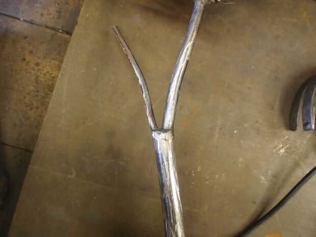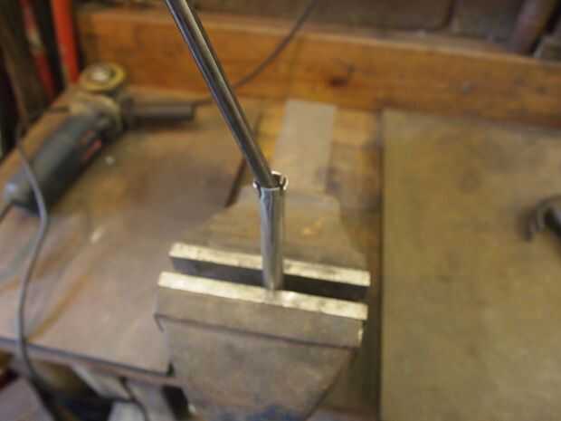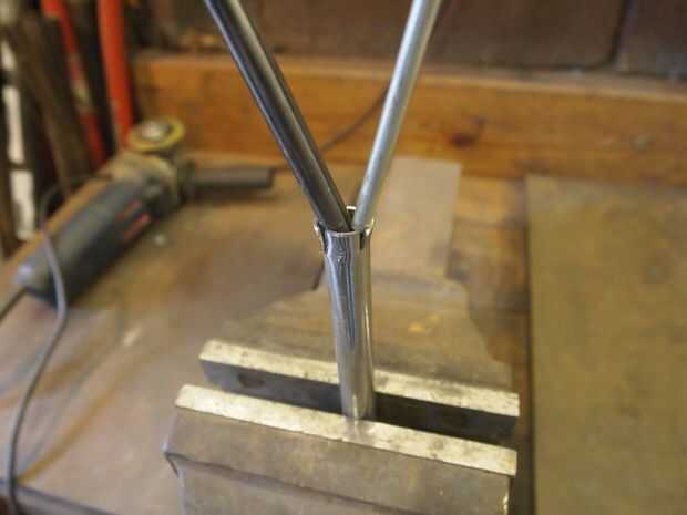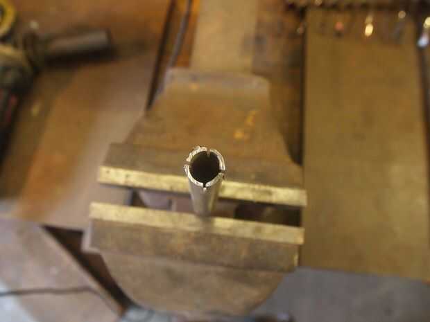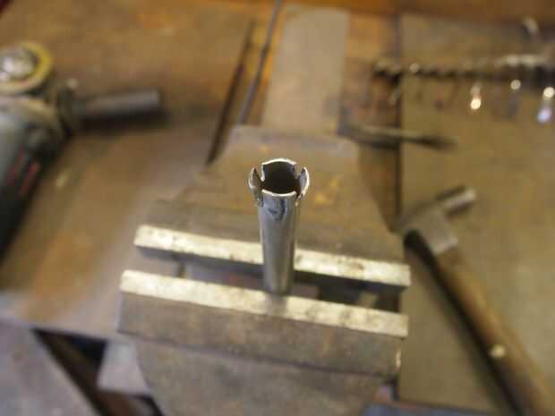 Utilizando una deriva de algún tipo (usted puede incluso utilizar la varilla de 6mm) flare a dos secciones opuestas como se muestra en la foto. También aplastar ligeramente en los otros dos. El tubo de 10mm debe encajar muy bien un ángulo. al elegir el ángulo para adaptarse a él en, oso en cuenta que tiene que alimentar un alambre a través de él, así que no lo hacen demasiado aguda! Tack soldarlo en su lugar.
