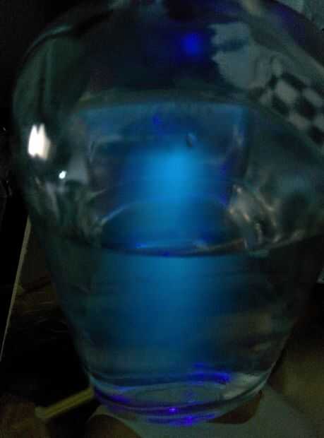 Llene la botella con el agua tónica y pop en el ensamblaje de la lámpara de corcho. Cuando la luz golpea el tónico debe brillar un azul vibrante.