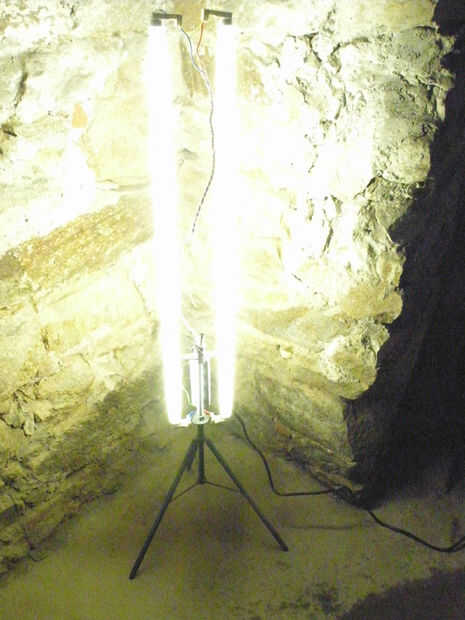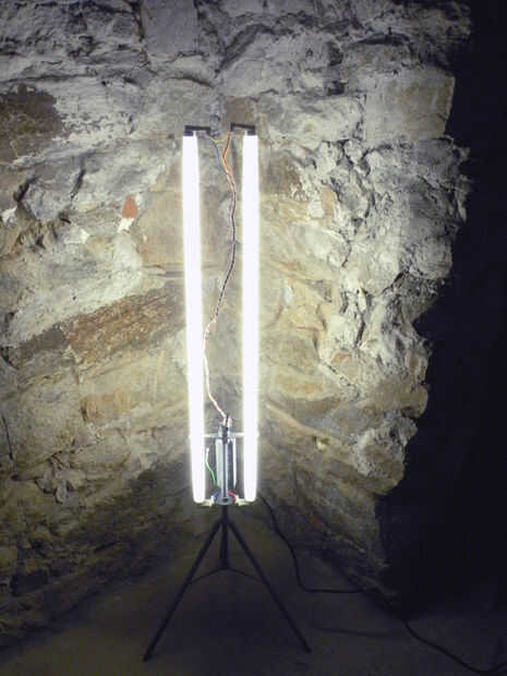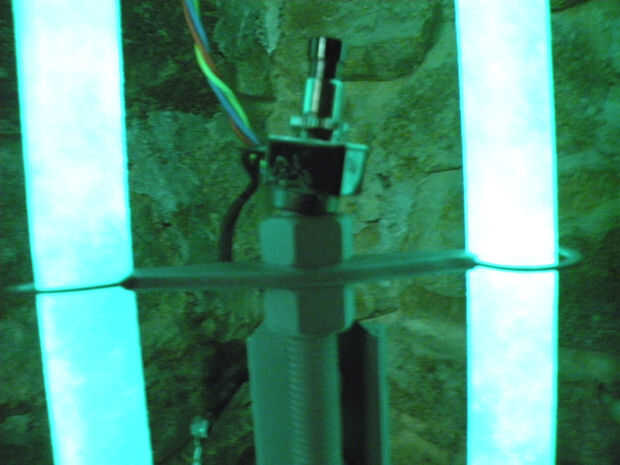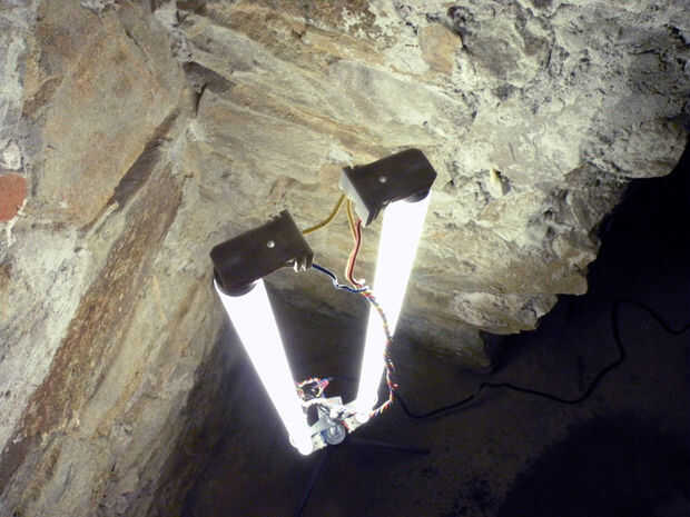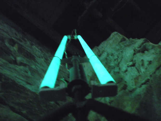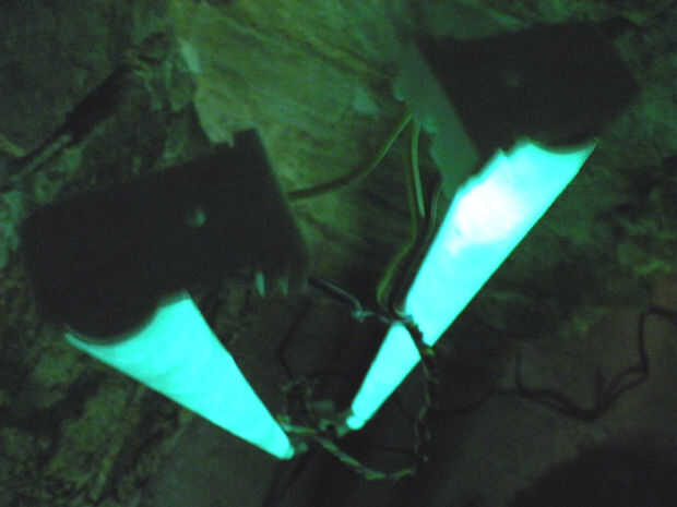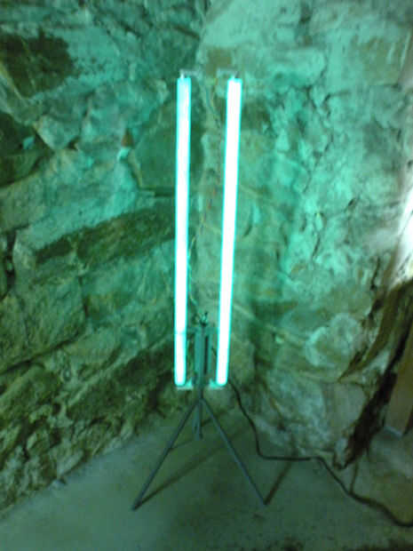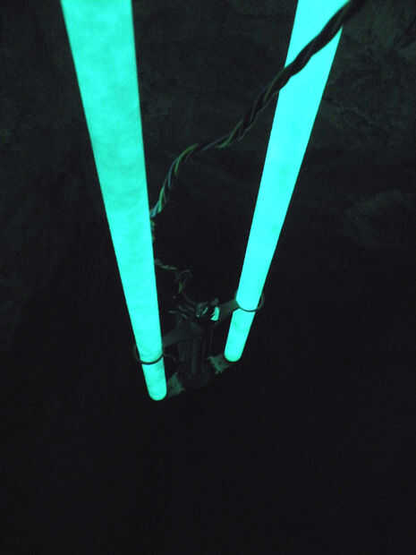 Al reducir la estructura de soporte y mecanismo eléctrico a un artefacto elegante, desnudo, no quería estropear el minimalismo con algún tipo de difusor voluminoso. Así que, decidí hacer la bombilla su propio difusor. Utilizando adhesivo en aerosol y spray laca, había cubierto dos tres pies largo, 1" diámetro tubos fluorescentes con el pigmento del resplandor superfino de alta calidad de un proveedor en línea. Cuando los bulbos estén apagados durante el día, todavía se ven blanco y relativamente lisa. Cuando se enciende, la acumulación de pigmento de brillo y laca difunde la luz algo (aunque no tanto como quisiera), y cuando, los bulbos para sobre una media hora después se gira el interruptor, desapareciendo gradualmente en la oscuridad.