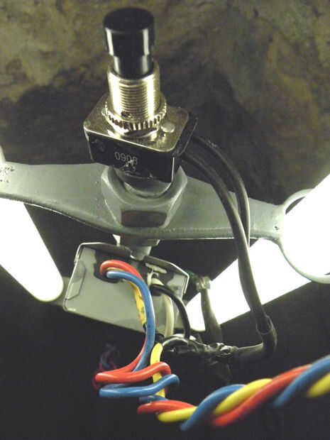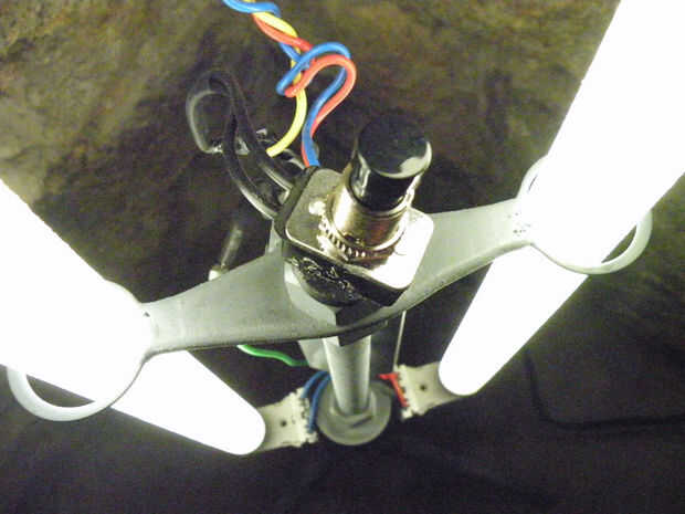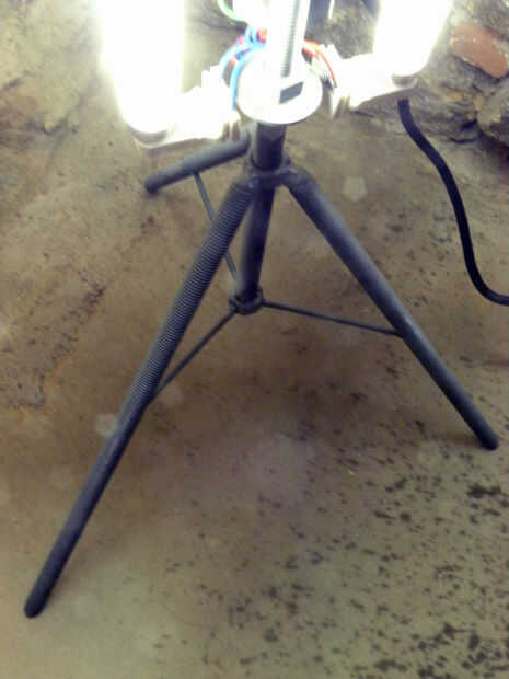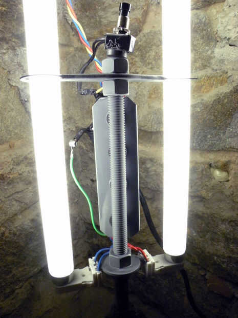 Las partes eléctricas provienen de una antigua tienda plug-in, fluorescente luz con dos lámparas de cuatro pies y una cadena. Eliminarán el reflector y tire la cadena, rescatar las tomas, balasto, cableado. Hice una nueva estructura para los bulbos con la barra de glavanized rosca 5/8" y 1/4" soldada con autógena en un trípode. Los casquillos de bombilla se rosca en hort segmentos de varilla roscada, soldada a una arandela cortada. Para mantener los bulbos vuelque, allí son dos anillos de retención conectados a una placa de madera y atornillados a la varilla roscada. El lastre y pulsador se unen a la estructura con imanes.