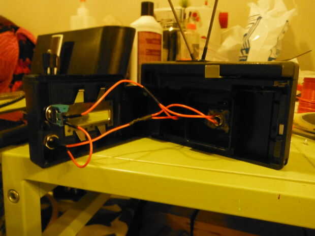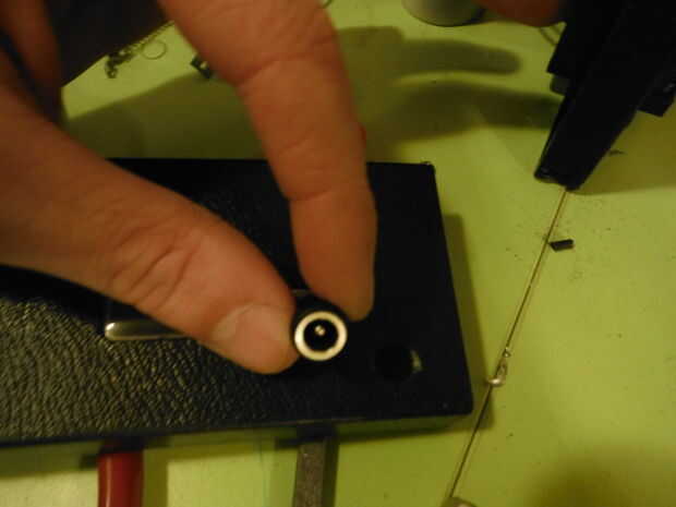 decidí montar mi interruptor y conector para mi adaptador AC en la parte posterior de la cámara, simplemente porque hay mucho espacio dentro del compartimiento de película para todos los cables y también tendrá en cuenta la profundidad de la parte trasera o el conmutador. Taladre un agujero para el interruptor y el otro para el conector en la parte posterior y fije ambos. Luego suelde el lado positivo de las bombillas al poste positivo del conector de adaptador AC. Suelde el lado negativo de las bombillas al interruptor y luego soldar otro cable del interruptor al poste negativo de tu conector del adaptador de CA.