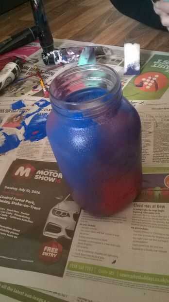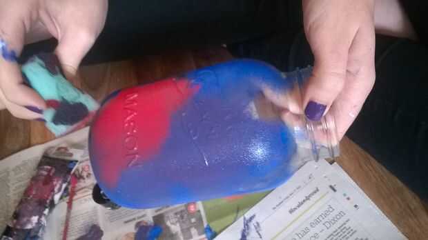 ahora es hora de agregar la pintura púrpura, asegúrese de que la pintura en el tarro es todavía un poco húmeda para permitir que los diferentes colores mezclar bien. Use una esponja y frote cuidadosamente en la superficie a aplicar pequeñas capas de la púrpura.