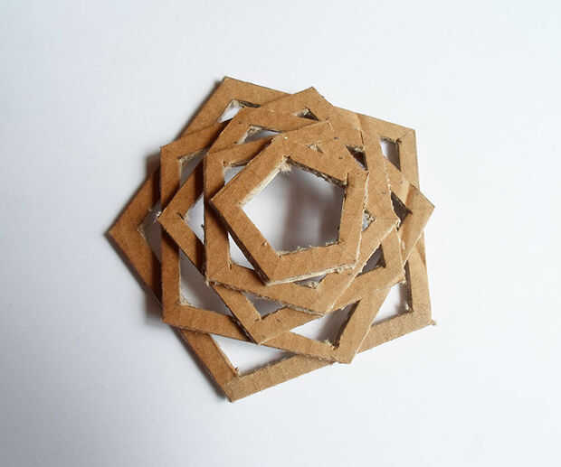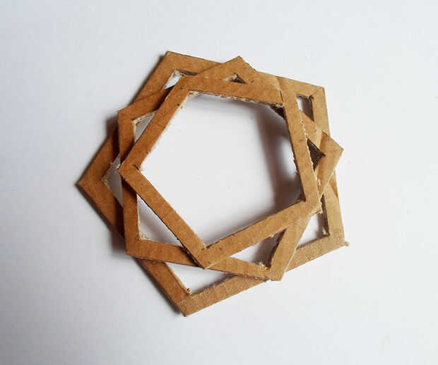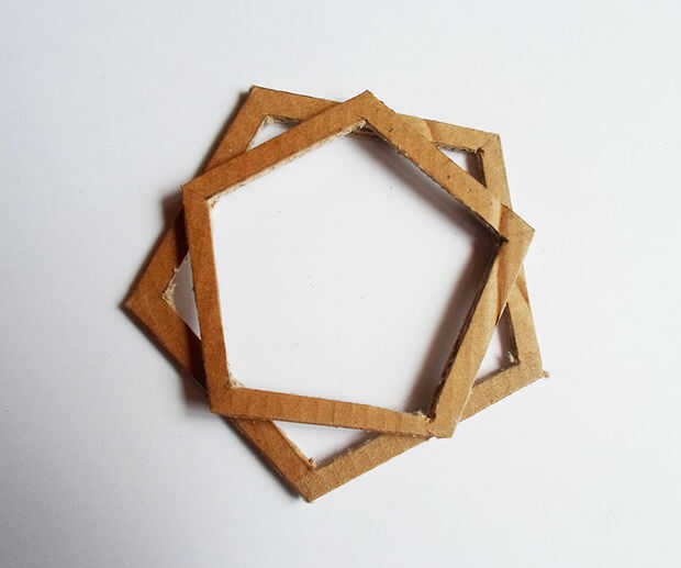 poner una más grande sobre una mesa y otro (más pequeño) en ella colocando los ángulos en los lados del grande del pegamento. A crear 5 triángulos pequeños alrededor.