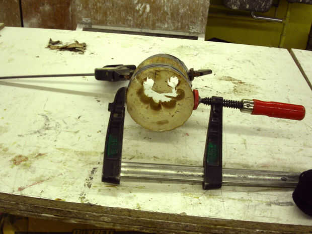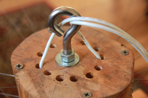Sacar una porción de 3/4"- 1" de la madera en un extremo de la vuelta corriendo a través de una sierra de cinta o una sierra de mano como alternativa. El segmento volverá a colocarse en el más adelante, así que registrar su ubicación en el resto de la ronda haciendo una marca de verificación Marque con un lápiz que se extiende por el corte que acaba de hacer. Taladro de una red de agujeros en la parte posterior de la rebanada para dejar ventilación aire caliente fuera de la luminaria. Ver la última foto abajo para cómo arreglé mina. Luego, en el centro de los orificios de ventilación que ha perforado, taladro otro que se ajuste a un medio al gran perno de ojo (3/8" o algo así) - se trata de donde colgamos la lámpara más adelante. Reservamos la rodaja.