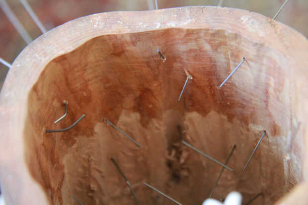 Inserte el cable de piano en los agujeros perforados usted solo, doblar los cables en el interior de la cáscara de madera con una pequeña "L" para que no deslice hacia fuera. Desde la parte más profunda del registro primero (parte superior de la cortina de madera) y luego trabajo su camino hacia la parte menos profunda de (parte inferior de la cortina de madera) para no raspar todos los extremos del alambre por las manos al llegar y salir cien veces... confianza me, aprendí la manera dura.