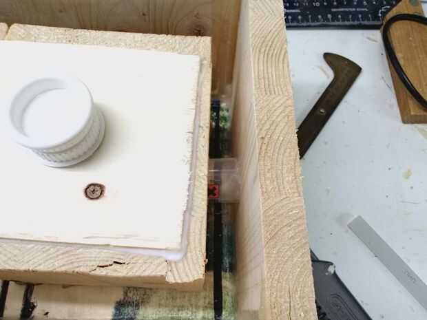 El espacio para la electrónica fue la razón por qué hice una segunda caja de madera con dimensiones más pequeñas y pegadas en el centro de la caja más grande. Usé algunos silicona para sellar las esquinas de la caja grande y deje que todo se seque. Pegué a tapas de plástico en el centro de la caja interna para que tenga un agujero en el hormigón para el zócalo de la bombilla.