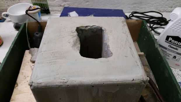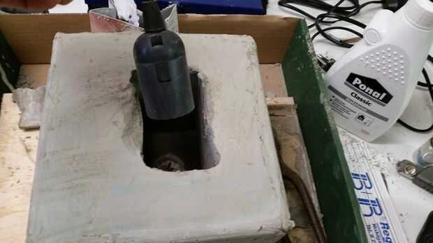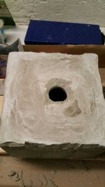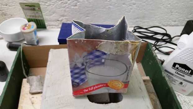 Para el segundo intento utilicé un cartón de leche en lugar de la caja de madera para conseguir una habitación en el centro el bloque de hormigón. Reutiliza las tapas de plástico para el agujero en el centro y esta vez todo fue bien. Después de que el concreto fue curado por un día quité la caja de madera y fue capaz de quitar el cartón de leche en el medio así. La caja de cartón ligeramente dobladas bajo la presión del hormigón y ahora tenía espacio suficiente para la toma - pero no para el arduino y el relé. Así que os adjunto sólo un cable regular con el interruptor a la toma. Después de un poco de lijado el encaje encaja perfecto en el agujero. Se hizo tiempo para poner en el foco y este pequeño proyecto.
