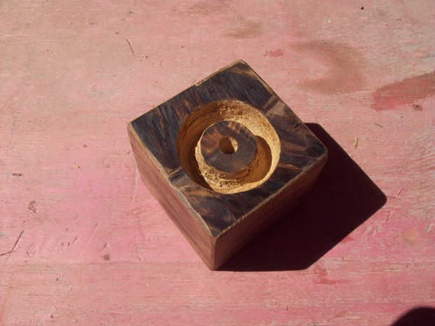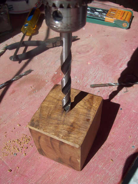 El orificio de la parte superior debe quedar en el centro del bloque de madera con el agujero de un lado, por lo que puede conectar el cable a la bombilla. Estos orificios deben ser lo suficientemente amplia como para pasar un cable a través y luego perforaron un poco más en cada extremo para dar cabida a la toma de la parte superior y el conector de cable de tipo "f" que sostenga el cable en su lugar.