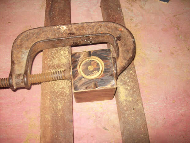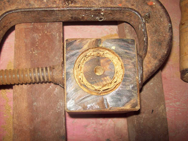 El agujero para la coctelera de condimento, que servirá como un globo de lámpara, es un poco más complicado. En primer lugar Fije el bloque de madera, para no girar fuera de control. (También ayudó a utilizar dos piezas de madera para apoyo de la abrazadera). Usé una sierra que fue 3,5 cm, pero luego encontró que necesitaba para ampliar un poco el agujero, para adaptarse a los hilos de la coctelera. Para ello, utilicé una combinación de un destornillador philips (talla de la madera en forma circular) y un archivo, prueba la coctelera de condimento de vez en cuando, hasta que tuve un ajuste ceñido.