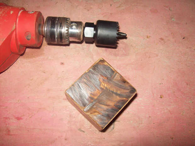 Si planea decorar su lámpara con monedas, esto es un buen momento para perforar los agujeros en el lado, con un poco de madera agujero que es el mismo tamaño que las monedas que va a utilizar. Se olvidó de ello en esta etapa y sólo estos agujeros perforados después que había manchada la madera.