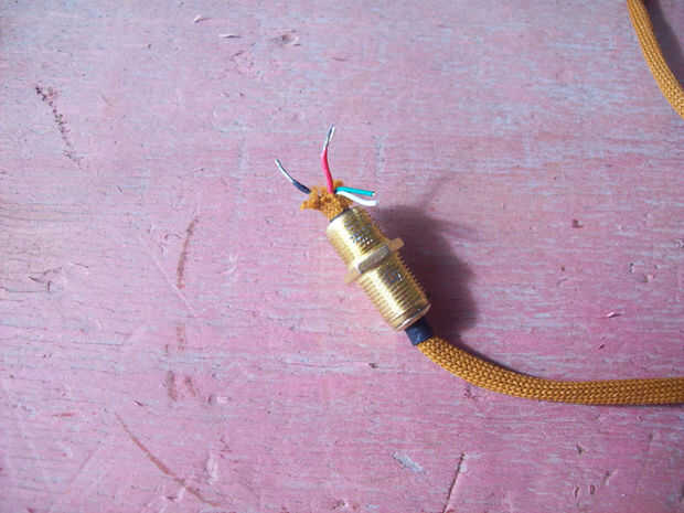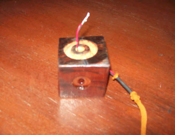 Exponer unas pocas pulgadas de los cables rojo y negro y darles de comer a través del orificio en la parte de su bloque de madera. Usted puede necesitar unas pinzas para sacar todo el camino por la parte superior. (Antes de hacer esto, no olvide pasar el cable a través de un pedazo del encogimiento del calor de la tubería y el conector de tipo "f", que se unirá más tarde).