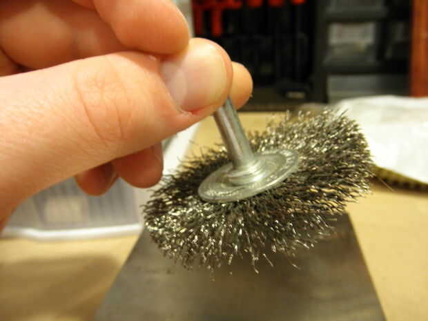 La tirada de un accesorio de taladro cepillo de alambre en una prensa del taladro o taladro. Si usted está usando sólo una pinza taladro su accesorio en un tornillo de latón. Estoy usando un taladro y sólo tiene que pulsar para el cepillo de la instalación y elimina la capa oxidada de cobre amarillo y realmente limpia todo.