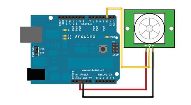 El PIR con 5V de alimentación y conecte a tierra. Luego conecte la salida a un pin digital. En este ejemplo, usaremos el pin 2.