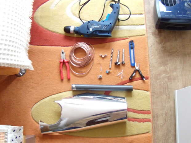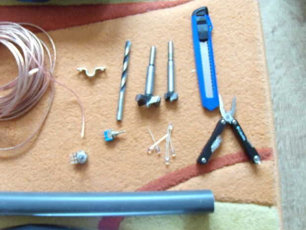 Para la base de la lámpara utiliza un pedazo de madera. Luego cubrí el tubo de plástico con papel de contacto plata, perforó un agujero en la base de madera, taladrar cuatro orificios en la parte superior del tubo plástico para los leds blancos.