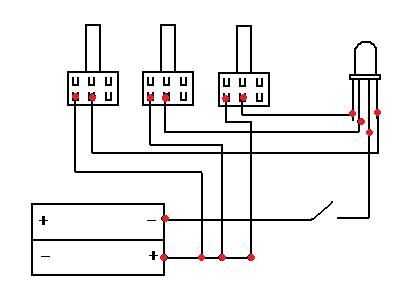 Soldar un cable desde cada potenciómetro a un plazo de ejecución corto en el led (1 bote por plomo).  Luego soldar un cable desde el cable largo para el swtich y otro cable desde el otro borne del interruptor a la terminal negativa en el soporte de la batería.  Otro alambre en el otro terminal en cada uno de los potenciómetros de la soldadura, luego soldar estos juntos. un alambre en el soporte del positivo de la batería terminal de la soldadura y soldar el otro extremo de este cable al grupo de cables que apenas soldadas de los potenciómetros.  Poner termocontraíbles o cinta aislante sobre esto si quieres.