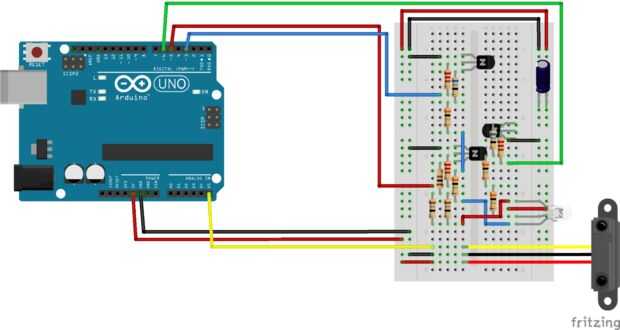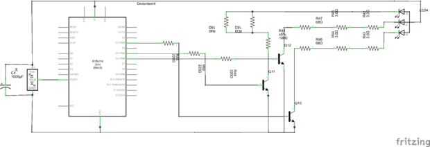 El circuito es una simple extensión del circuito original de Francisco. Sin embargo, puesto que utiliza un LED que puede manejar más corriente, he utilizado valores de resistencia diferentes.