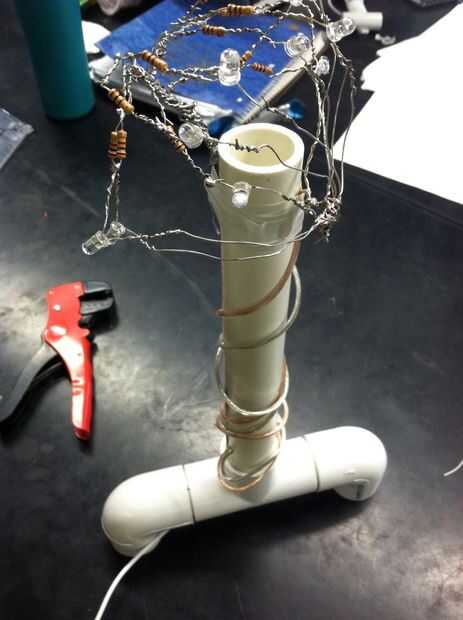 Después de pasar los cables, soldar los LEDs a los cables de cobre. Conecte los LEDs recién adjuntos al PVC con una pistola de pegamento caliente o cinta solo. Alambre de cobre con el USB y tendrás una lámpara de trabajo LED.