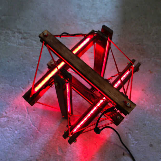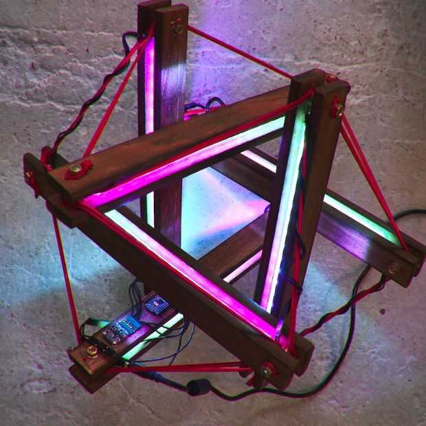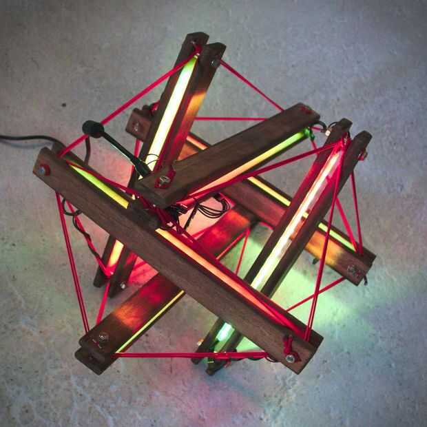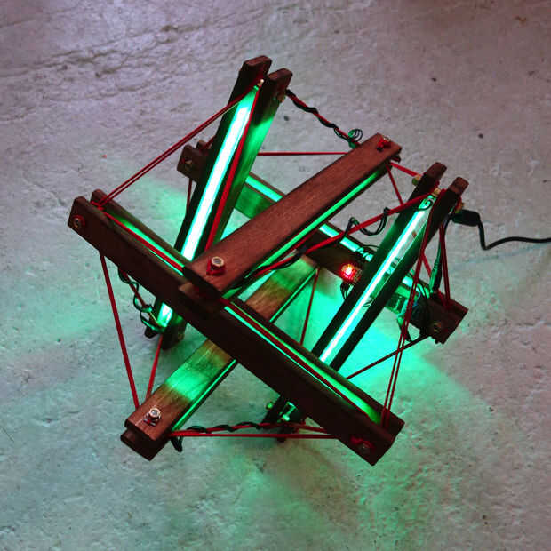 Esta pieza es una lámpara sensible al movimiento. Concebido como una escultura mínima tensegridad, la lámpara cambia su configuración de colores en respuesta a la orientación y movimientos de toda la estructura.