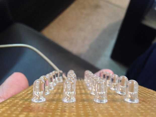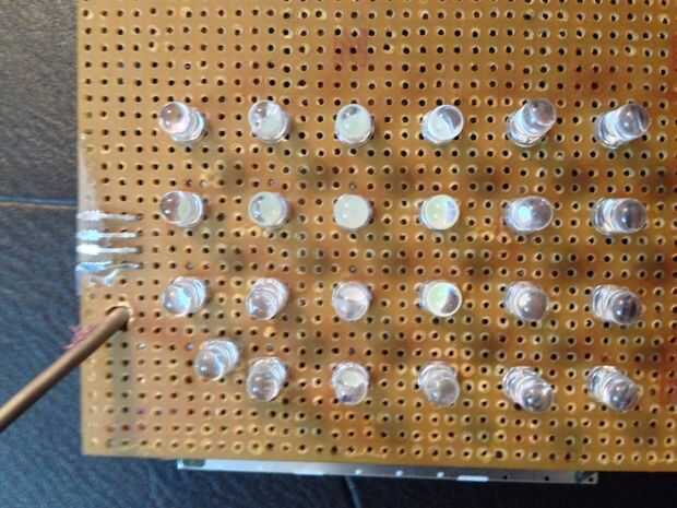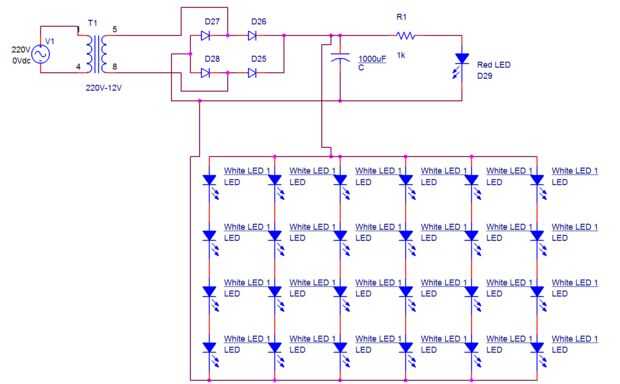 Y aquí es cómo se diseña la matriz de LED. Compone de 24 LEDs (blanco) conectados como matriz de 6 x 4. 4 LEDs en serie y en paralelo con 5 grupos de LEDs conectan 4 en serie. No necesitamos una resistencia limitadora porque: