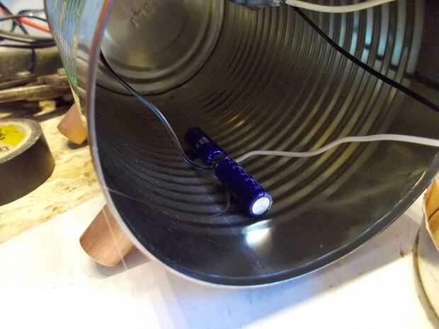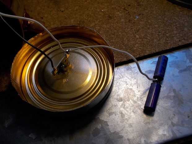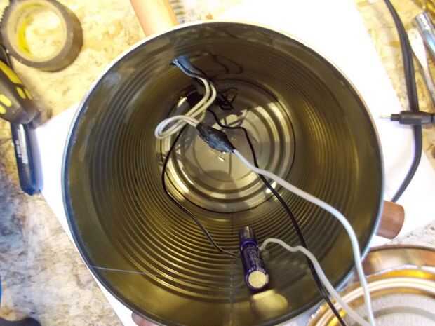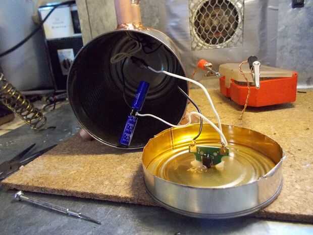 Ahora puede insertar el interruptor en su lugar, pegar el condensador dentro de la lata y aislar toda la conexión con cinta aislante y pegamento caliente.