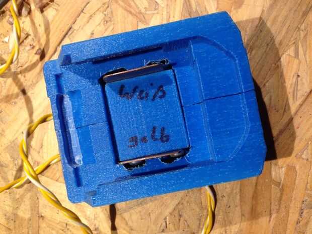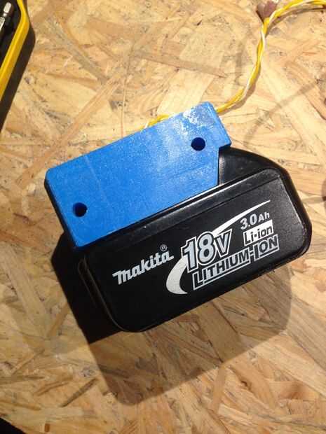 Para la batería Makita diseñé un adaptador que puedo imprimir en mi impresora 3D. Los contactos para conectar las baterías no son fijos, por lo que no aplican una fuerza a la bateria. Los contactos están hechos de una pieza de cobre que obtuve de un tubo de cobre.