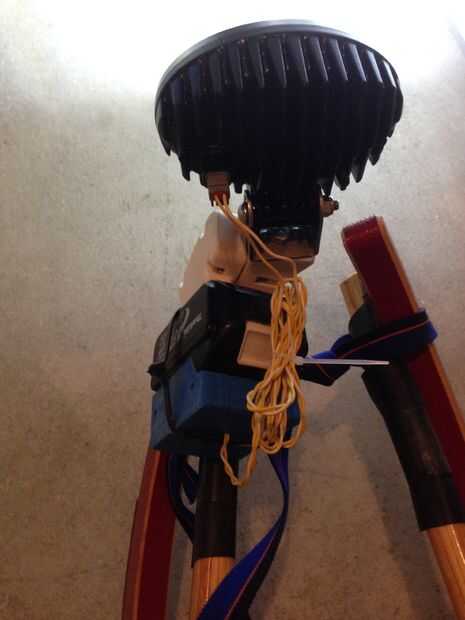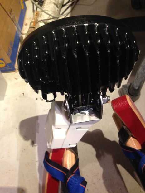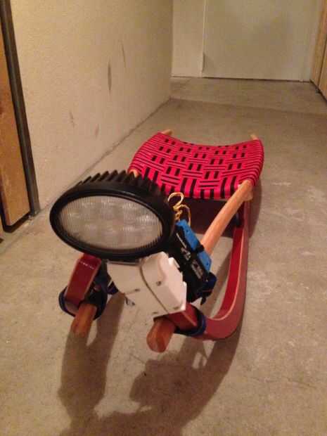 El trineo es trineo tradicional que tiene la capacidad de dirigir con la pierna y el peso del conductor. Debido a los patines son flexibles y decidí fijar la lámpara a un resbalón.