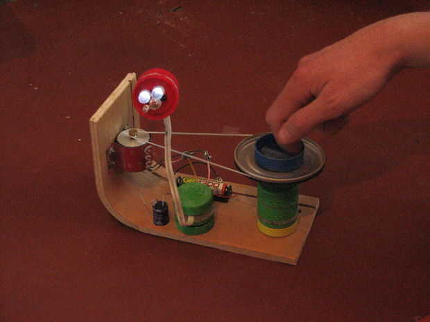Jugando con la polea. Debe hacer un montón de pegado. Pegue un pedacito de la pluma (4cm de largo) dentro de la tapa de la botella de agua (a través del centro para tener un agarre de dedo). Ahora pega este cap en el centro de una tapa metálica de un frasco de conservas (en el lado interno). Tomar una tapa de plástico de un Nescafé grande que puede cortar un anillo y este anillo en el otro lado de la tapa metálica del pegamento. Para hacer un cinturón, tomar una longitud de cuerda elástica y atar los extremos con un nudo simple. Ensamble y prueba de la construcción.