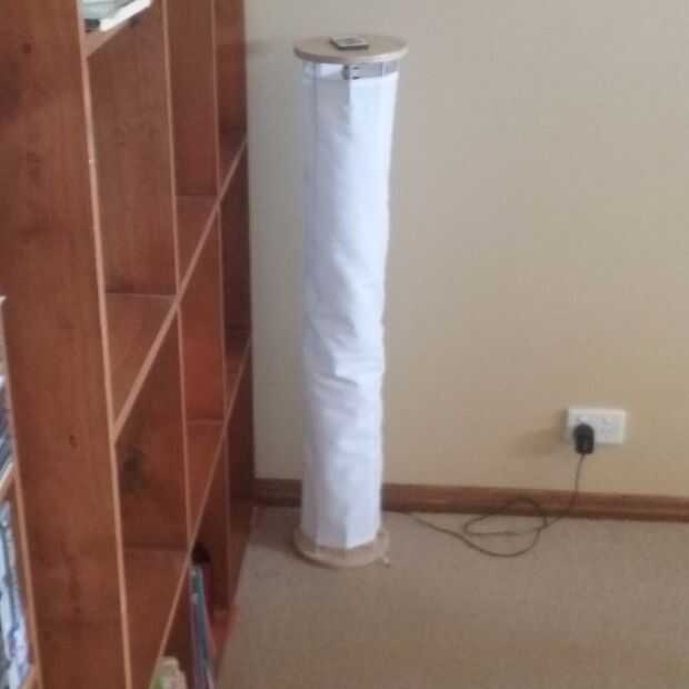 I cortar una pieza de material, lo había encerrado y había hecho un bolsillo para 1 de las barras de aluminio. Esto fue un poco como hacer un cilindro de tela grande. El bolsillo es simplemente hay que asegurarse de que el cilindro esté alineado y, honestamente, no realmente lo necesita. El truco con esta parte de la lámpara de pie es que está allí para difundir la luz, así que no necesita ser perfecto... un poco flojo es buena. Usted puede ver, en mi foto, que el difusor es un poco apretado... pero está muy bien, creo que parece bastante bueno.