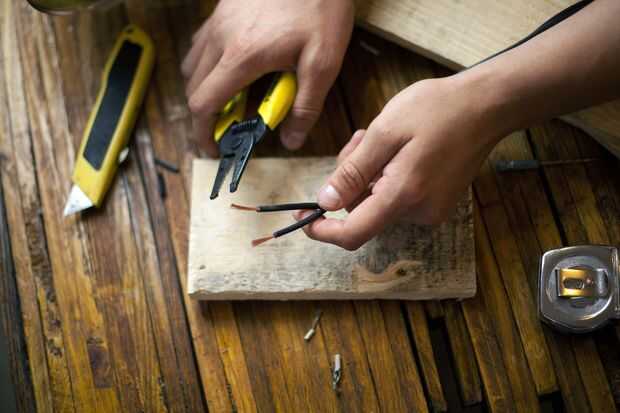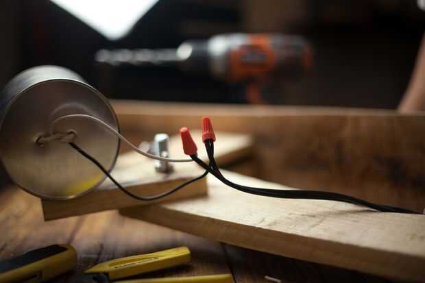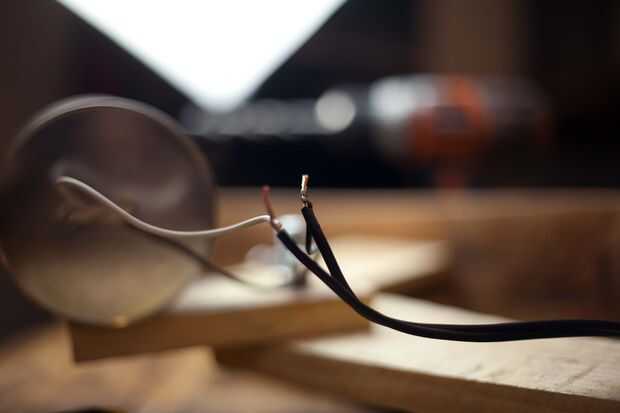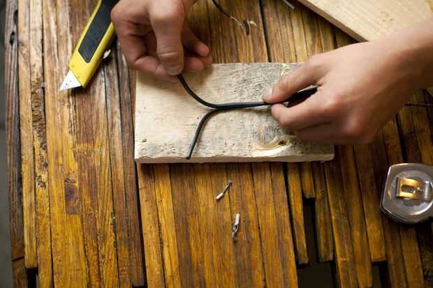 Tome el cable de la lámpara y Pelamos los extremos aparte (puede hacer esto con un cúter y un pedazo de chatarra madera). Pele los extremos de los cables de la lámpara y conecte al enchufe de la bombilla torciendo el desgaste. Enrosque tapas de alambre sobre el desgaste para cubrir el cobre expuesto.