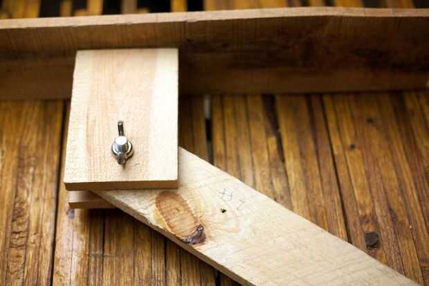 Coloque el tablero largo de dos pies entre los pies de dos 6 pulgadas y perfore un orificio de 3/8 de pulgada a través de las juntas. Inserte un #24 x 2 pulgadas pernos y apriételos con la perilla #24.